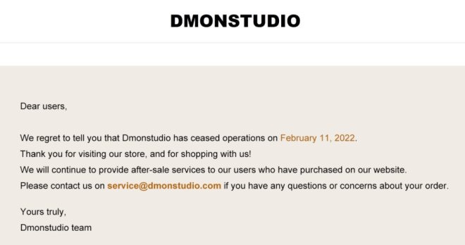 近日,Dmonstudio在官網(wǎng)發(fā)布公告稱網(wǎng)站運(yùn)營于2月11日起關(guān)停,團(tuán)隊(duì)會繼續(xù)為已購物消費(fèi)者提供售后服務(wù),對訂單有疑問的用戶可通過官方郵箱聯(lián)系團(tuán)隊(duì)。