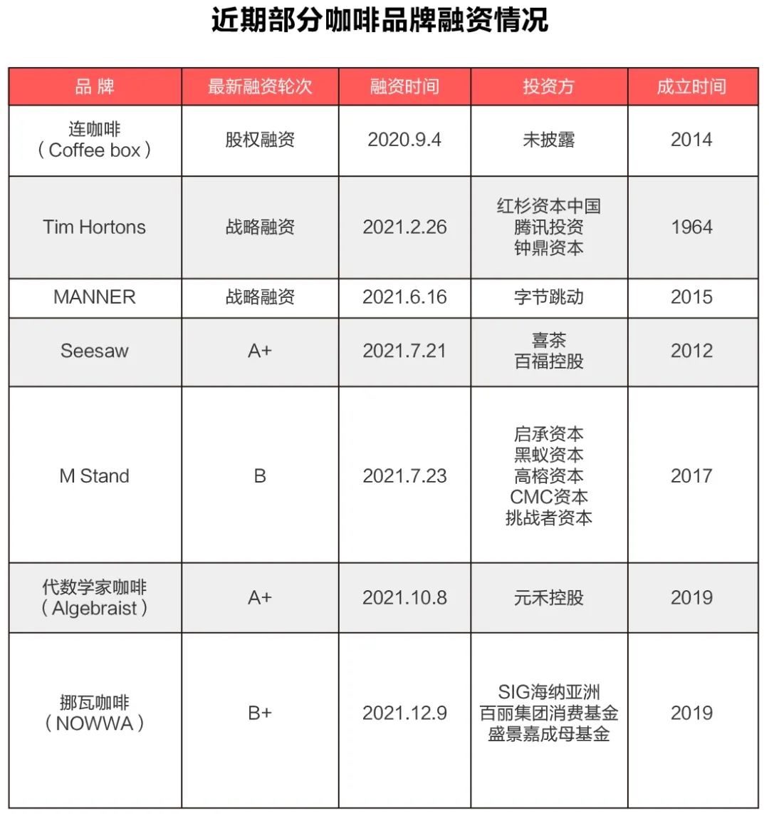 一邊是頭部資本加速入場,2021年全年咖啡領(lǐng)域共發(fā)生21起投資案例,總金額高達到59.21億元超過前兩年的總和,這些融資背后除了紅杉、SIG等知名基金外,不乏字節(jié)、美團龍珠等產(chǎn)業(yè)資本的加入。