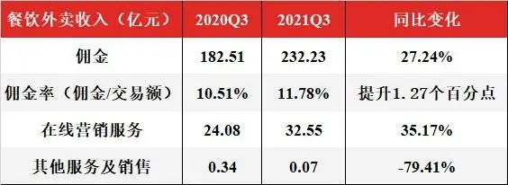 不過(guò),新模式的推行反而提高了美團(tuán)的整體傭金率。2021年三季度,美團(tuán)外賣(mài)業(yè)務(wù)的傭金率為11.78%,同比提升了1.27個(gè)百分點(diǎn)。