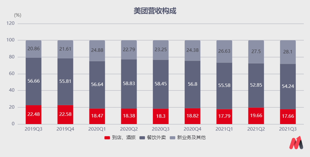 從營(yíng)收貢獻(xiàn)上看,美團(tuán)外賣(mài)業(yè)務(wù)占據(jù)了半壁江山。最新季度顯示,美團(tuán)外賣(mài)業(yè)務(wù)的收入占比達(dá)54.24%。