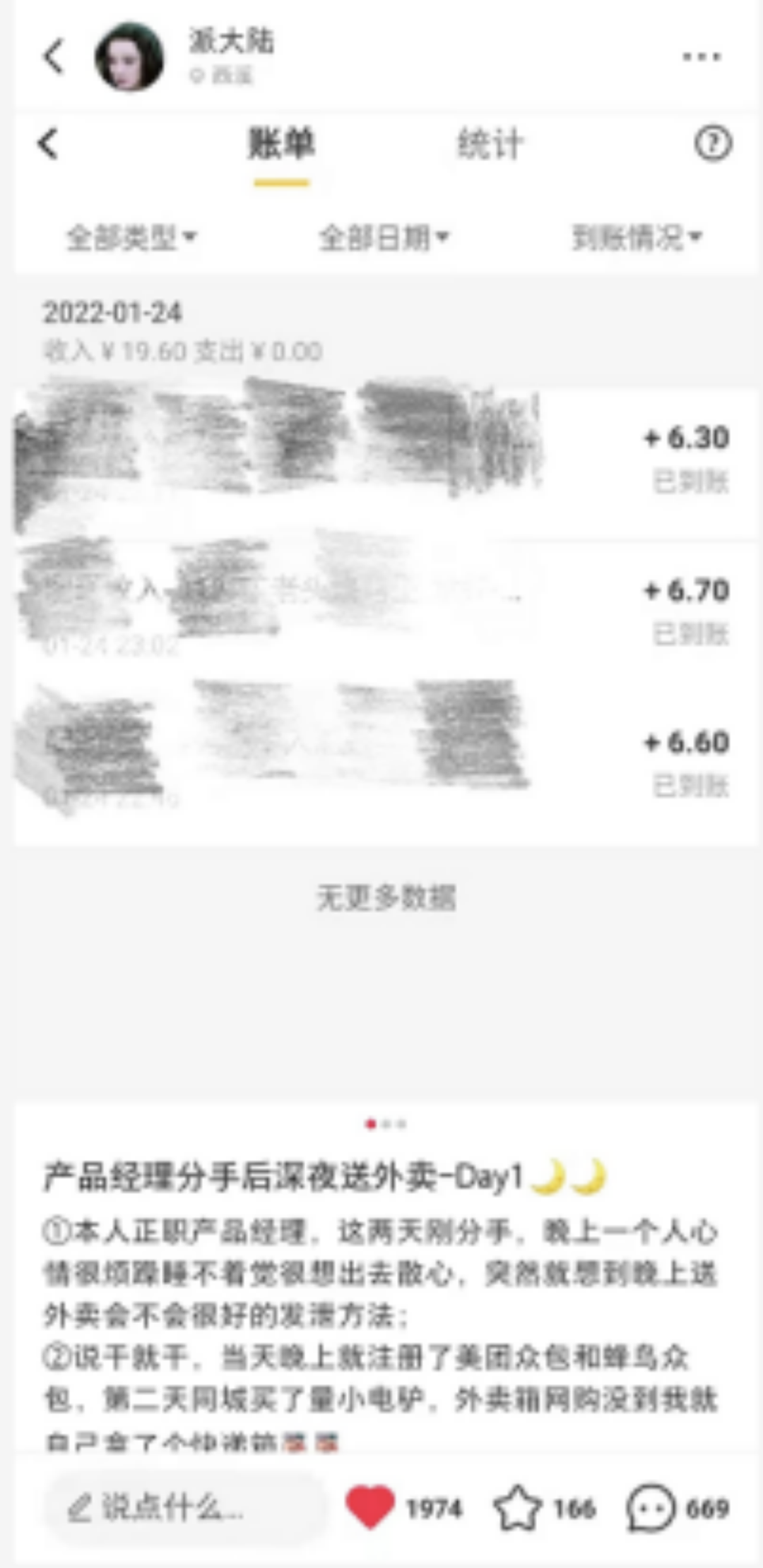 因?yàn)槲易鍪虑榭偸侨齑螋~(yú)兩天曬網(wǎng),我就把每天派送的記錄發(fā)送到小紅書(shū)上,自己給自己打卡。沒(méi)想到,很多人定時(shí)來(lái)刷我的動(dòng)態(tài),有的問(wèn)我怎么找的兼職,有的跟我聊工作壓力、失戀體會(huì),萬(wàn)萬(wàn)沒(méi)想到我還以這種方式交到了朋友。