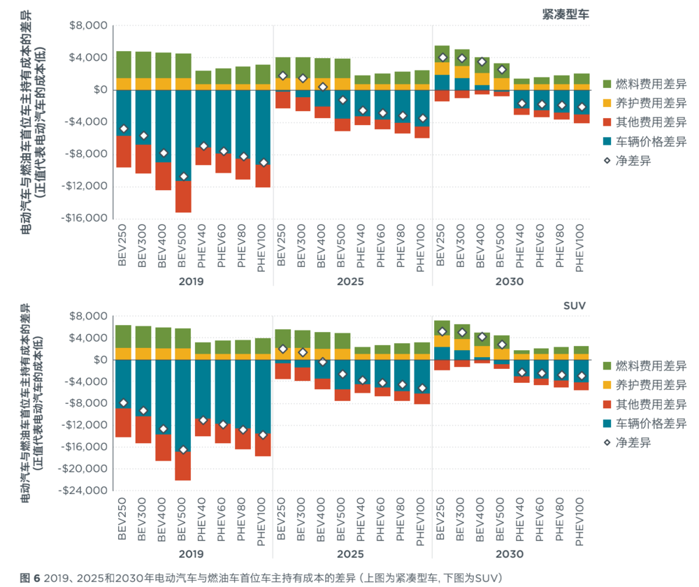以緊湊型車為例,2025年購買緊湊型汽油新車的消費(fèi)者在5年的首位車主持有周期內(nèi)平均需要支付的燃料費(fèi)用,比緊湊型BEV新車的消費(fèi)者多出2400-2600美元。同樣的,BEV的養(yǎng)護(hù)費(fèi)用,也比汽油車節(jié)省1600美元。而SUV的結(jié)果相比緊湊型車的成本差異的絕對(duì)值更大,但基數(shù)也更大。
