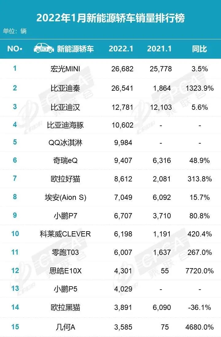 在比亞迪1月的9.5萬輛總銷量數(shù)據(jù)中,最搶眼的還是定位A級(jí)轎車的比亞迪秦,以1323.9%的同比增長率,緊緊咬住宏光MINI的尾巴,兩者僅相差141輛。其次,就是定位A0級(jí)的比亞迪海豚以10,602輛成績位列第四。定位A00級(jí)的奇瑞新能源的QQ冰淇淋以9,984輛位列第五。前者是首次沖進(jìn)前五,而后者也是剛賣了一個(gè)月,就沖進(jìn)前五。