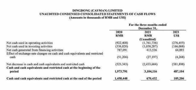 截至2021年12月底,叮咚買菜現(xiàn)金及現(xiàn)金等價物和短期投資只有52.3億元,其中現(xiàn)金部分為6.6億元,環(huán)比減少約16億元。