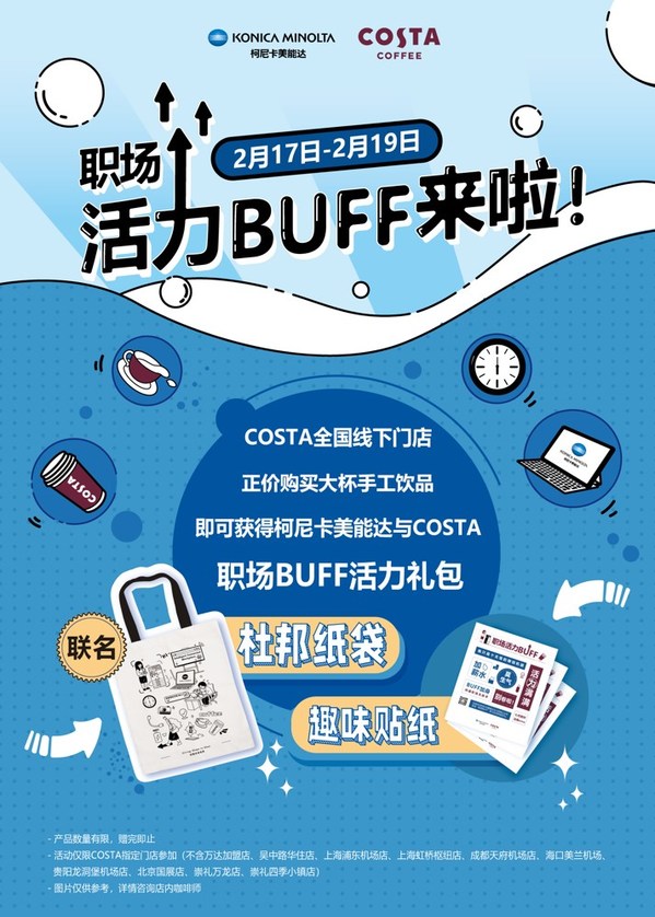 本次推出的“職場活力BUFF套餐”是柯尼卡美能達聯(lián)合COSTA面向終端消費者進行的首次跨界嘗試,共計聯(lián)動了COSTA全國400余家門店參與活動。消費者前往COSTA指定門店正價購買大杯手工飲品,即可免費獲得這份限量套餐,套餐內(nèi)包含了環(huán)保杜邦紙袋以及職場趣味貼紙。