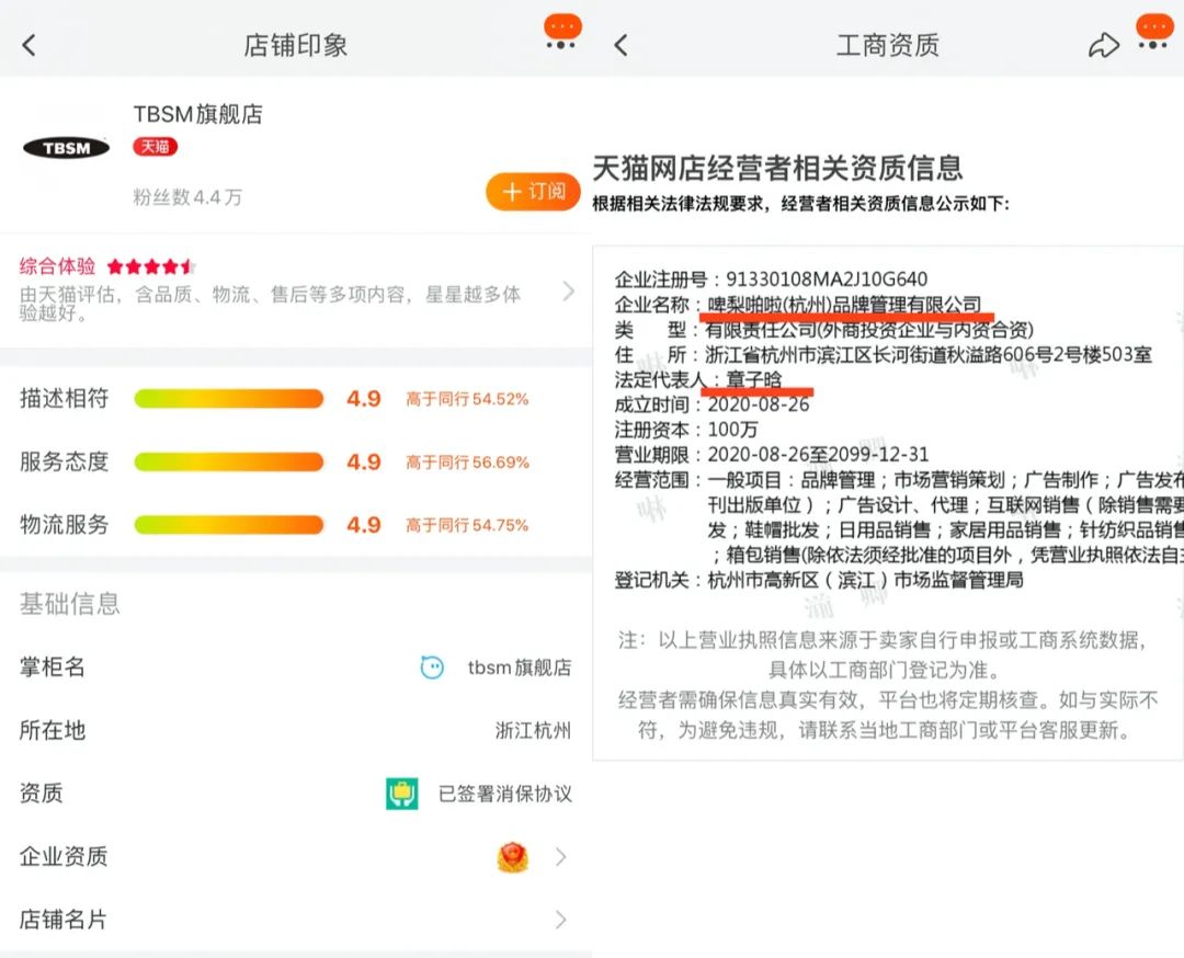 另一家店鋪TBSM旗艦店,則坐實(shí)了光光直播團(tuán)隊(duì)和雪梨之間存在利益關(guān)聯(lián)。在女裝品類(lèi)上,光光每場(chǎng)直播均主要為T(mén)BSM旗艦店帶貨,而該店鋪的注冊(cè)主體為啤梨啪啦(杭州)品牌管理有限公司,法人為章子晗,即和雪梨一起創(chuàng)建宸帆的主要合伙人。