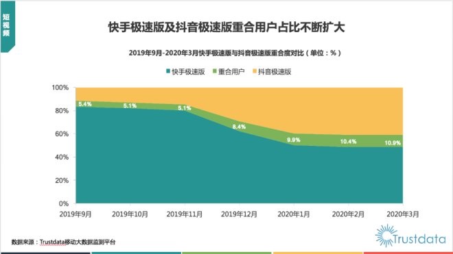 同時,快手極速版與抖音極速版的用戶也在不斷重合。移動大數(shù)據(jù)監(jiān)測平臺Trustdata報告數(shù)據(jù)顯示,兩者用戶重合度已從2019年9月的5.4%,上升到2020年3月的10.9%——其背后,正是抖音極速版對快手極速版的不斷蠶食。有報道稱,抖音極速版、火山版如今在東北三省用戶偏好度尤為顯著,在快手大本營滲透率越來越高。