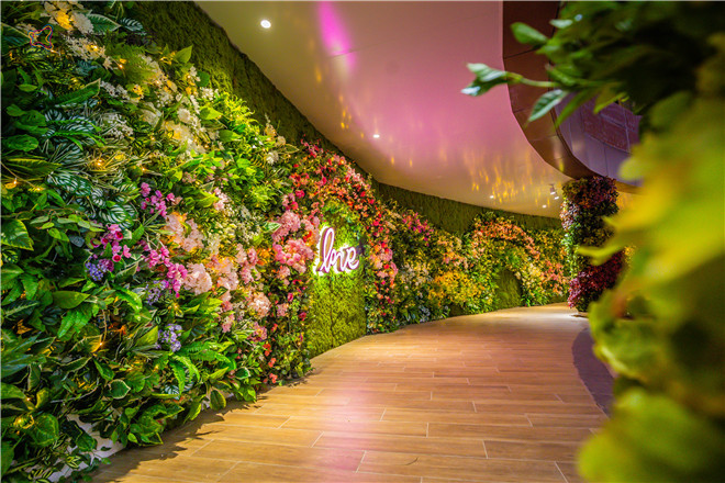 整體的氛圍打造也是十分到位,充斥著整個商場。尤其是負(fù)一樓西南廣場的弧形花藝墻,不僅用薔薇、美女櫻等百種主題花卉盛開其中,定制的“LOVE”拱門造型也成為情人節(jié)期間最受歡迎的打卡地標(biāo)。