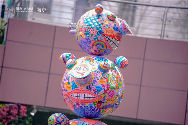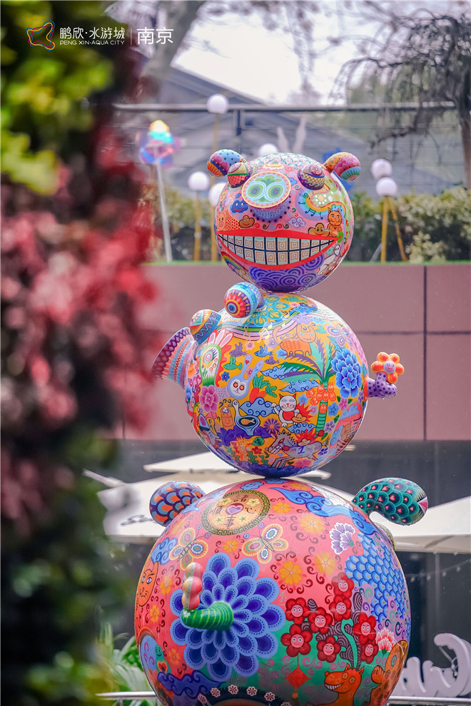此次南京水游城聯(lián)手中國臺灣新銳藝術(shù)家洪易打造的藝術(shù)美陳,正是基于上述理念的一次呈現(xiàn)。結(jié)合在地屬性的元素、色彩、圖像及寓意,打造了金錢蛙、財(cái)貓、豬福年年三個IP形象,構(gòu)建出鮮明的特色意像。深入分析后,有以下三個特征值得行業(yè)借鑒。