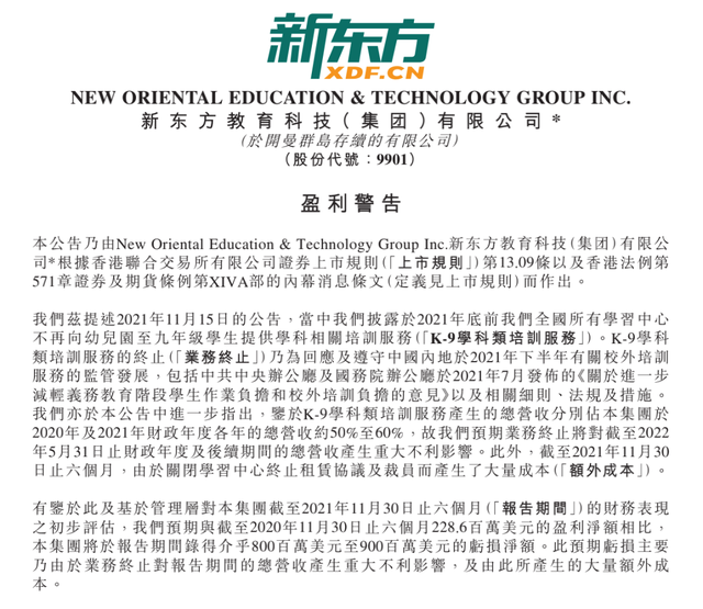 1月21日,新東方公告,預(yù)期集團(tuán)截至2021年11月30日止6個(gè)月,錄得8億美元至9億美元的虧損凈額,主要由于業(yè)務(wù)終止對(duì)報(bào)告期間的總營收產(chǎn)生重大不利影響。