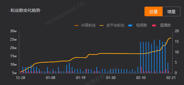 據(jù)新抖數(shù)據(jù)顯示,自2021年12月28日新東方“東方甄選”開始帶貨以來,截至2月20日,該品牌帶貨直播30次,累計(jì)觀看人次401.71萬,累計(jì)直播銷售額549.47萬;場(chǎng)均在線人數(shù)1214、場(chǎng)均直播時(shí)長4.52小時(shí);場(chǎng)均銷量3675件、場(chǎng)均銷售額18.32萬;總上架商品數(shù)367個(gè)。