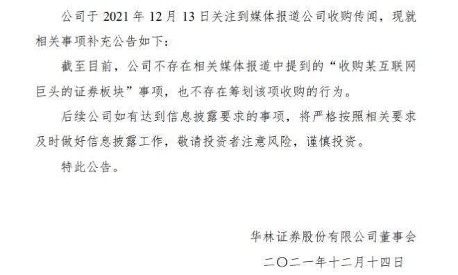同時,在去年12月初,曾有相關媒體報道稱,華林證券將收購某互聯(lián)網(wǎng)巨頭的證券板塊。12月14日凌晨,華林證券發(fā)布澄清公告稱,公司不存在收購某互聯(lián)網(wǎng)巨頭的證券板塊事項,也不存在籌劃該項收購的行為。