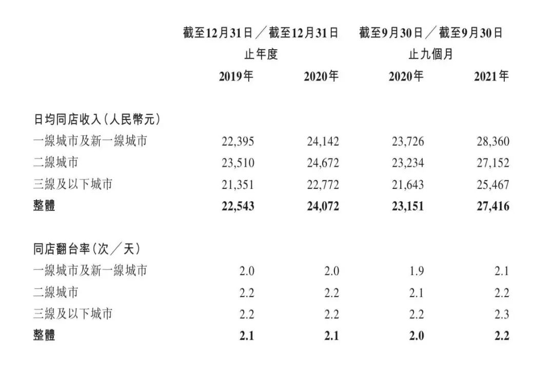 2019年至2021年9月,七欣天也采取了漲價策略,堂食客單價從117元漲到131元,但招股書顯示,翻臺率反而從2.1提升至2.2。