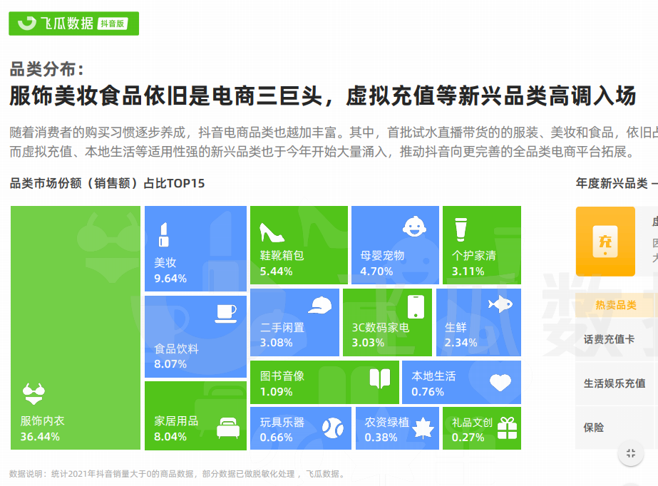 根據(jù)飛瓜數(shù)據(jù)發(fā)布的《2021年抖音短視頻及直播營銷年度報告》顯示,服飾、美妝、食品已經(jīng)成為抖音電商的“三巨頭”。2021年,抖音上服飾內(nèi)衣品類的銷售額占比已經(jīng)達到36.44%。而服飾和美妝都是淘寶的核心品類。