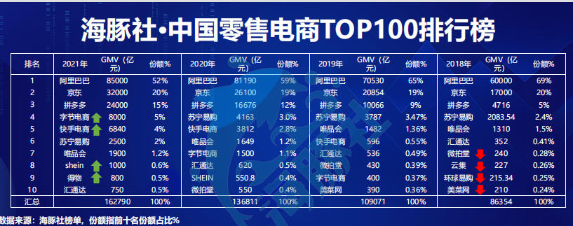 根據(jù)海豚社的數(shù)據(jù),2021年,抖音電商的市場份額已經(jīng)占到5%,僅次于阿里、京東和拼多多三巨頭。從400億元的GMV到8000億元,字節(jié)跳動只花了三年。而快手電商的GMV也從2019年的596億元擴張到2021年的6840億元,市場份額也達到4%。