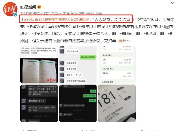 或許大廠員工的名頭更容易引起大家的關(guān)注,但其實在昨晚同樣也發(fā)生了一起猝死事件。一個#95后設(shè)計師猝死生前聊天記錄曝光#的標簽同樣醒目地掛在微博熱搜上。