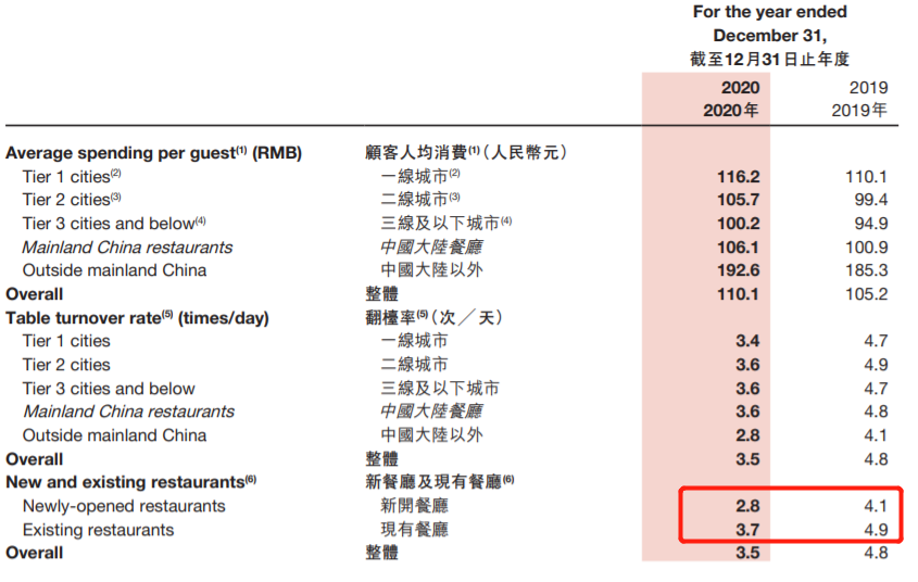 新門(mén)店的營(yíng)收雖沒(méi)有具體數(shù)據(jù)披露,但翻臺(tái)率的縮減能一定程度體現(xiàn)新店的經(jīng)營(yíng)狀況。巔峰時(shí)期的海底撈,平均翻臺(tái)率在5次/天,遠(yuǎn)高于行業(yè)水平。而到了2020年,新開(kāi)門(mén)店的平均翻臺(tái)率由4.1次/天下降至2.8次/天,2021上半年則只有2.3次/天,同期也都低于老門(mén)店的翻臺(tái)率。