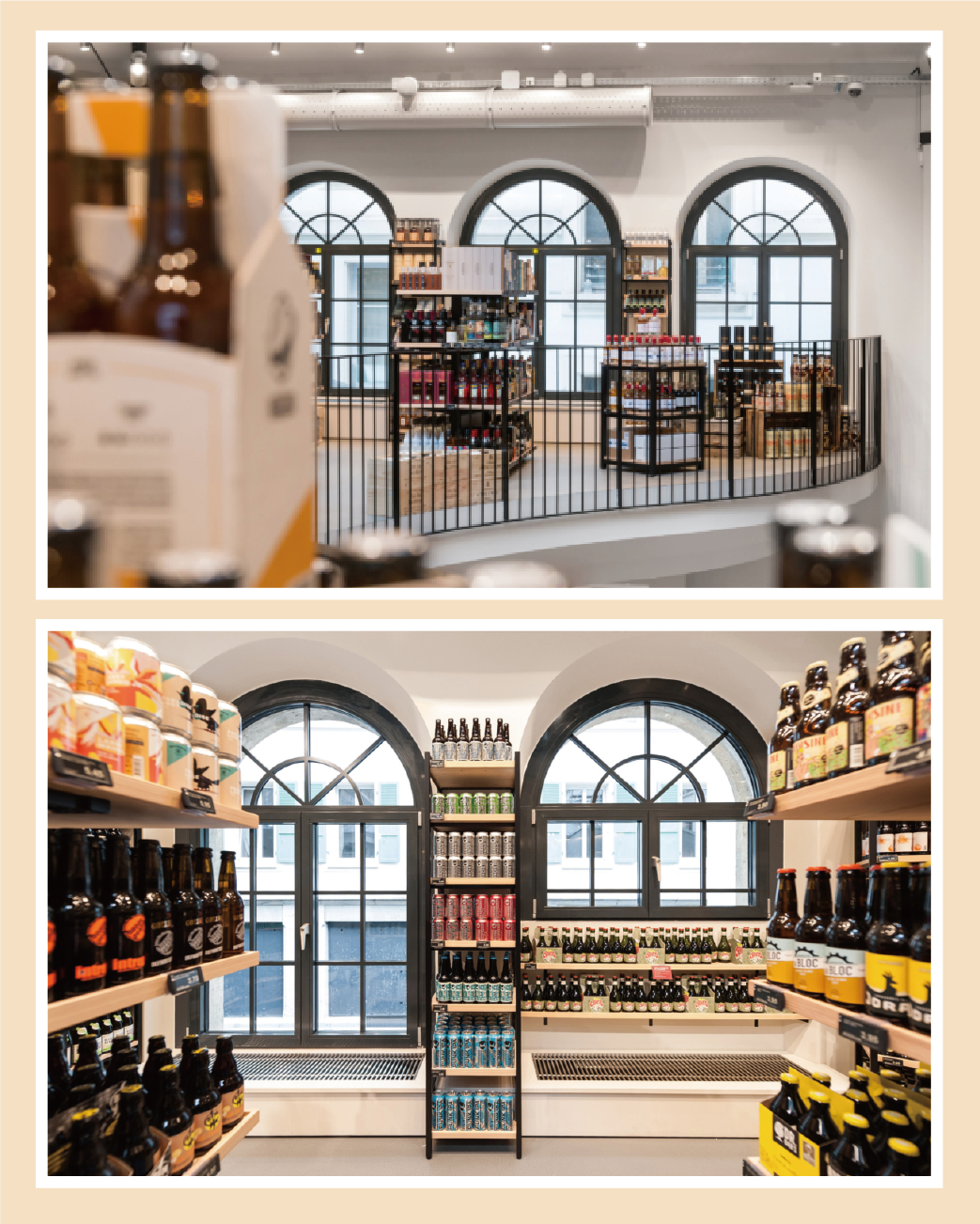 2層全部為酒飲賣場,啤酒由當(dāng)?shù)蒯劸茝SLa Nébuleuse 和 WhiteFrontier供應(yīng),葡萄酒來自沃州和洛桑市的莊園。除此以外,還有從法國進(jìn)口的葡萄酒。顧客可在1層購買肉制品和奶酪的冷盤,在2層試飲,侍酒師為顧客推薦合適口味的葡萄酒或啤酒。