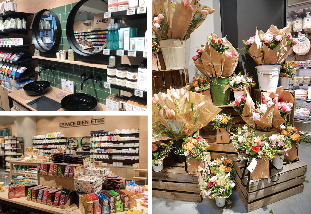 健康區(qū)位于1層的另一個(gè)入口。主要陳列預(yù)包裝食品、廚房用具、裝飾餐桌的花卉、化妝品、家居用品及書籍等。以健康、美和生活為主題,重點(diǎn)經(jīng)營有機(jī)、環(huán)?沙掷m(xù)和公平貿(mào)易的商品。如谷物、豆類、堅(jiān)果、干果采用玻璃罐裝、散稱售賣的形式。入口處設(shè)置了果汁吧,為顧客提供鮮榨果汁等飲品。