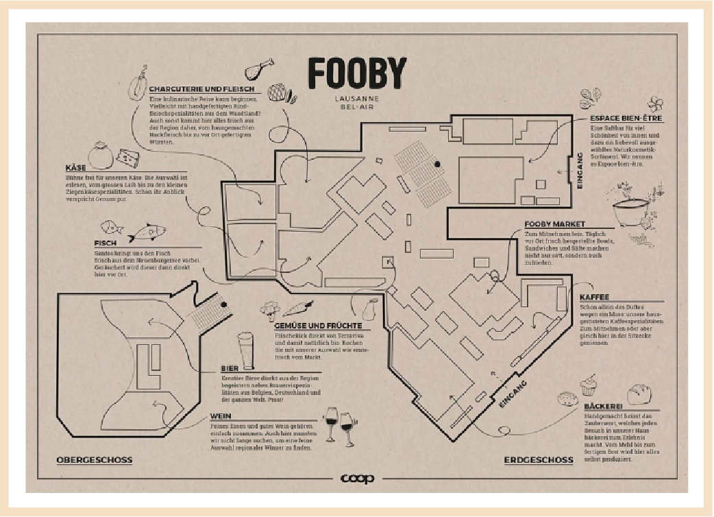 2019年3月,瑞士大型零售集團(tuán)Coop旗下的美食菜譜內(nèi)容平臺Fooby在洛桑市Bel-Air廣場,推出線下概念體驗(yàn)店。該店通過在概念建筑及視覺營銷上的創(chuàng)新獲得2020年歐洲零售設(shè)計(jì)獎(ERDA)