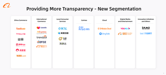 這次季報是阿里去年底組織架構(gòu)調(diào)整后的第一份。阿里在財報中將自己的業(yè)務(wù)重新劃分為七大板塊,最主要的變化就是將過去的核心電商業(yè)務(wù)分成四部分,即國內(nèi)電商、國際電商、本地生活和菜鳥。