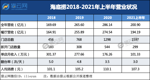 2018年底,海底撈的門店為466家,2019年新增308家,2020年新增544家門店,2021上半年新增了299家,平均每天就新增1.64家門店。截至2021年6月30日,海底撈全球門店總數(shù)為1597家。
