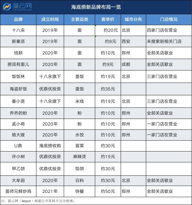 2019年下半年開始,海底撈開啟多元化探索,相繼推出了包含面、粉、米線、蓋飯、日料等餐食在內(nèi)的多個(gè)快餐品牌,但過半品牌都已經(jīng)折戟。據(jù)相關(guān)媒體報(bào)道稱,尚存活的品牌價(jià)位上有所上漲。