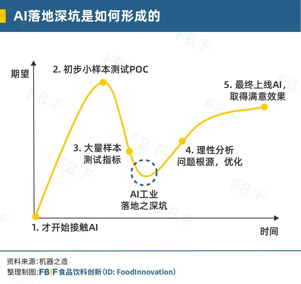 另一方面,當(dāng)AI與食品工業(yè)相結(jié)合時,企業(yè)往往會遇到“AI落地深坑”的陷阱。阿丘科技創(chuàng)始人黃耀表示,在數(shù)百個工廠實地考察中,他發(fā)現(xiàn)AI在工業(yè)檢測領(lǐng)域的落地就像技術(shù)成熟度曲線,往往存在一個低谷,即AI落地深坑。
