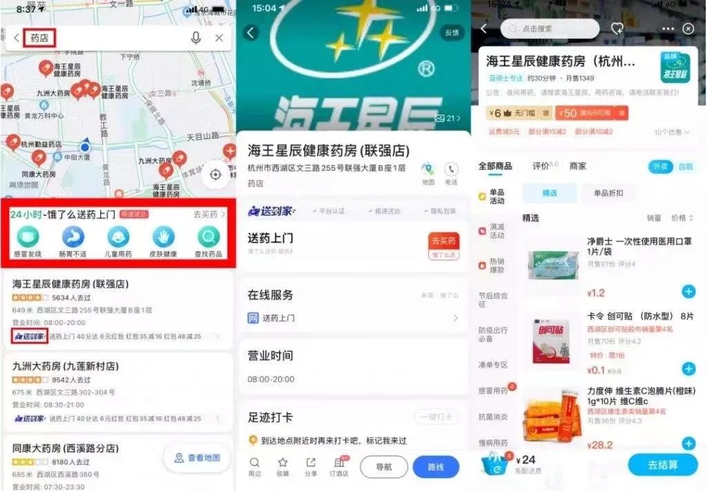 去年餓了么聯(lián)合高德地圖推出的“地圖找藥”服務(wù)就是一個典型案例。通過該服務(wù),近10萬家在線藥店接入高德地圖。用戶在高德地圖搜索“買藥”,即可查找附近的藥店、藥品,并可外賣到家。目前已有近300個城市實現(xiàn)24小時送藥到家服務(wù)。