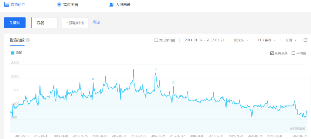 百度指數(shù)顯示,從2016年開始,西餐的整體指數(shù)開始下滑,到了2020年,更是呈現(xiàn)出明顯的下滑趨勢(shì)。