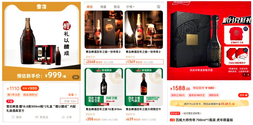 不久前,青島啤酒“一世傳奇”超高端藝術典藏新品登場,市場指導價1399元/瓶;同時,百威啤酒上線“百威大師傳奇虎年限量版”,電商平臺標價單瓶1588元;還有華潤雪花啤酒推出超高端品牌“醴”,售價999元/套。