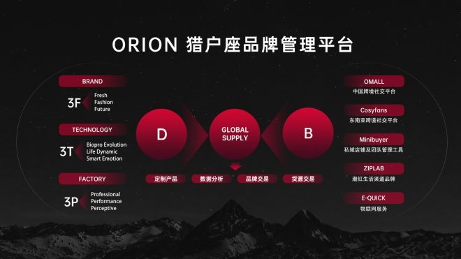 在供應(yīng)端,以“品牌(Brand)、科技(Technology)、工廠(Factory)”為支撐,提供從品牌的輸出孵化,到具備技術(shù)壁壘的研發(fā),再到供應(yīng)鏈快速反應(yīng)的全體系搭建,為B端實(shí)現(xiàn)可見的增值轉(zhuǎn)化;在連接端,提供研發(fā)、產(chǎn)品、品牌、金融、渠道、營銷、數(shù)據(jù)的全域閉環(huán)體系,為B端提供整體品牌解決方案;在應(yīng)用及渠道端,依托全球化跨境直賣電商平臺「O’Mall」、東南亞跨境直賣電商平臺「CosyFans」、私域店鋪及團(tuán)隊(duì)管理工具「Minibuyer」、潮紅生活渠道品牌「ZIPLAB」、物聯(lián)網(wǎng)服務(wù)的「E-Quick」,五大渠道體系滿足全球更廣域的人群需求。