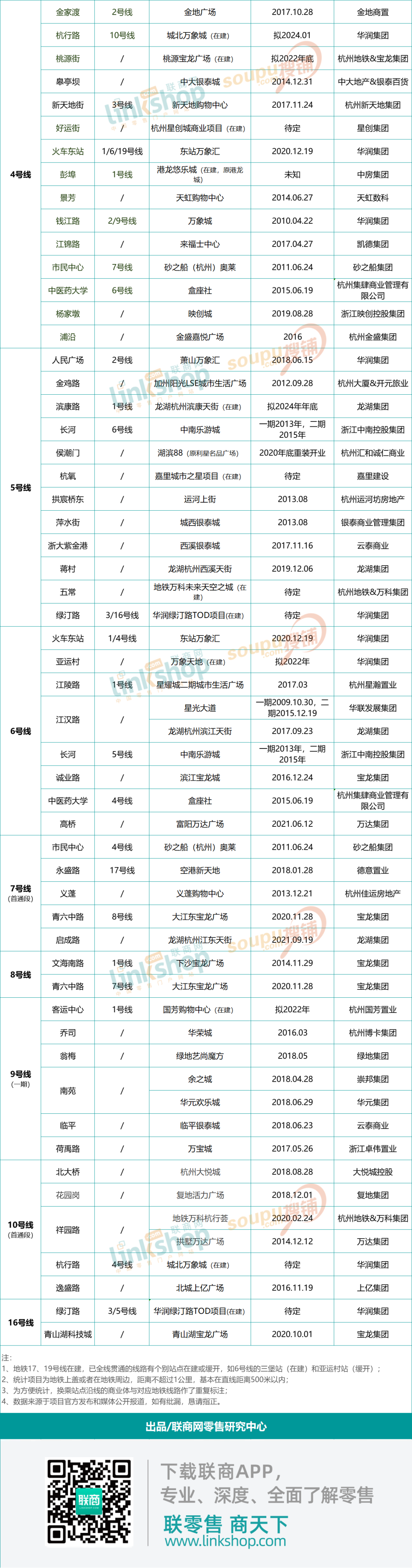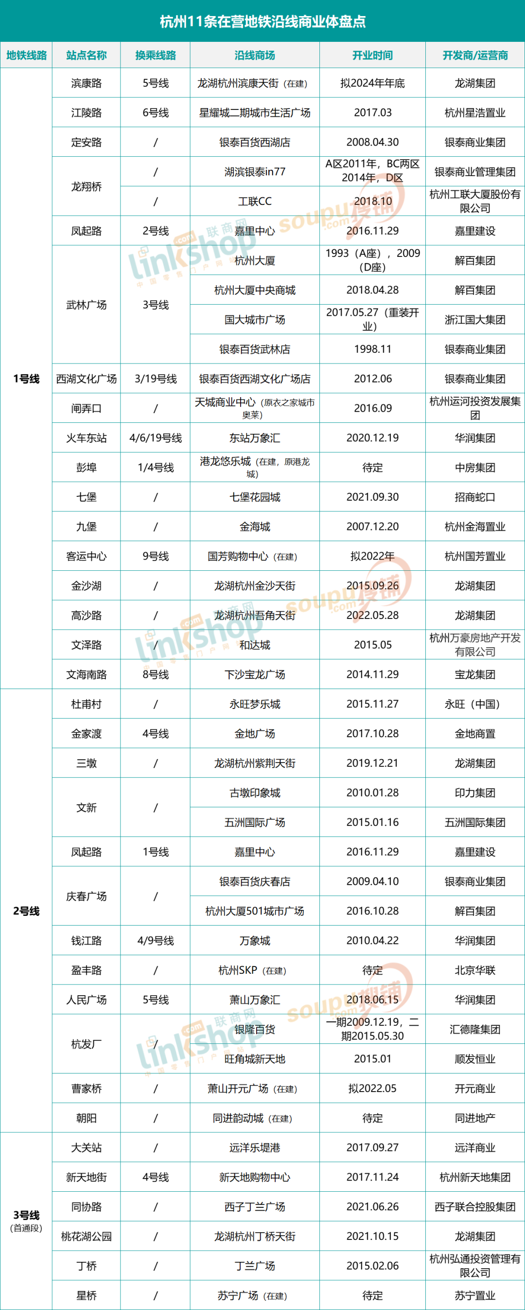 附杭州11條在營地鐵線路沿線商業(yè)體盤點: