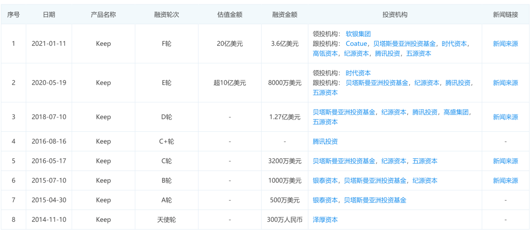 根據(jù)企查查的公開(kāi)數(shù)據(jù),成立于2014年的Keep在赴港IPO之前,已完成八輪融資。其中,最近的F輪融資金額達(dá)到3.6億美元,公司估值也隨之飆升至20億美元,合約126億元人民幣。