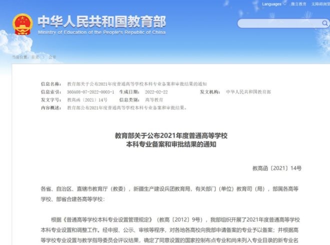 ▍截自 教育部公布的“2021年度普通高等學(xué)校本科專業(yè)備案和審批結(jié)果”