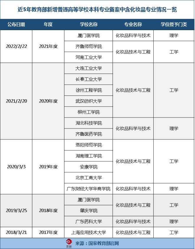 可喜的是,近日,教育部公布了2021年度普通高等學(xué)校本科專業(yè)備案和審批結(jié)果,在新增備案本科專業(yè)的名單中,3所高校新增了化妝品專業(yè)。