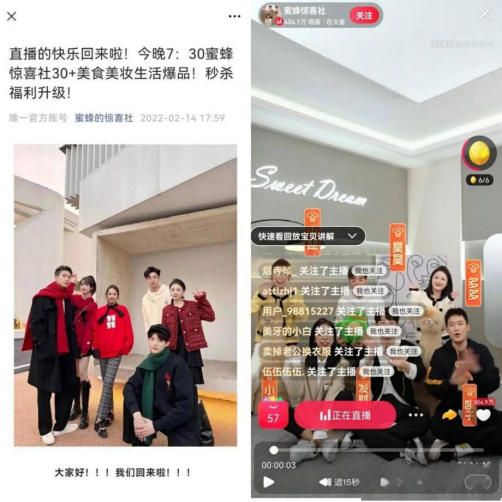 而“跌倒后”的薇婭,在外界看來,是以“蜜蜂驚喜社”的形式重新回到了這個(gè)行業(yè)。這家成立于去年8月的公司,有5位主播曾經(jīng)是薇婭的助播,其中更有薇婭的侄女多多在列。