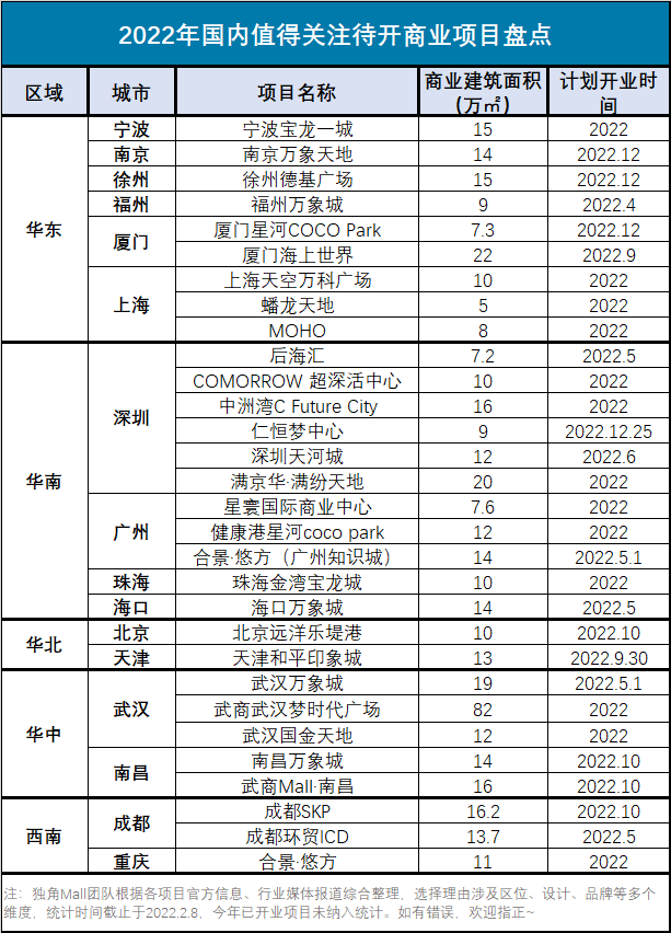 2、統(tǒng)計(jì)時(shí)間截止于2022年2月8日,今年已開(kāi)業(yè)的項(xiàng)目未納入統(tǒng)計(jì);