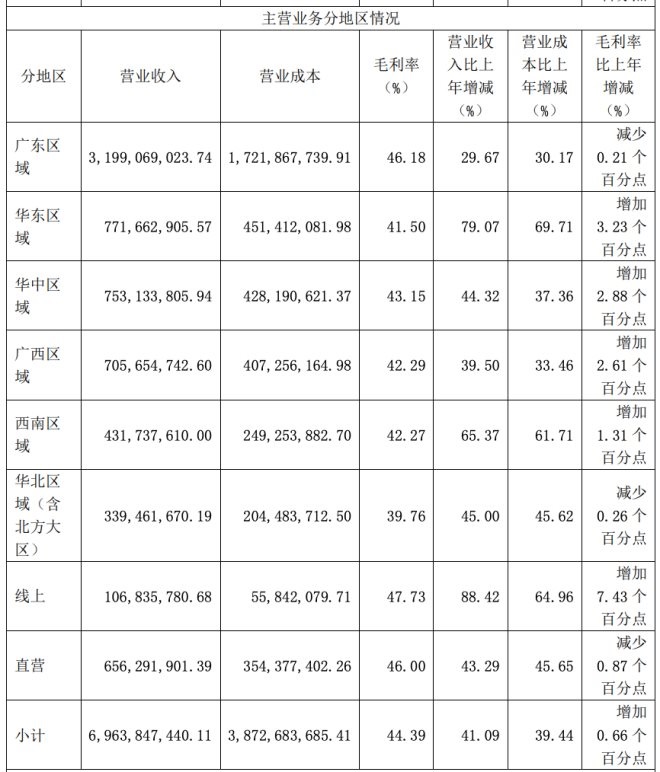 具體來看,公司廣東區(qū)域銷售收入31.99億元,同比增加29.67%;華東區(qū)域?qū)崿F(xiàn)銷售收入7.72億元,同比增加79.07%;西南區(qū)域?qū)崿F(xiàn)銷售收入4.32億元,同比增加65.37%;華北(含北方大區(qū))實現(xiàn)銷售收入3.39億元,同步增加45.00%;華中區(qū)域?qū)崿F(xiàn)銷售收入7.53億元,同比增加44.32%。