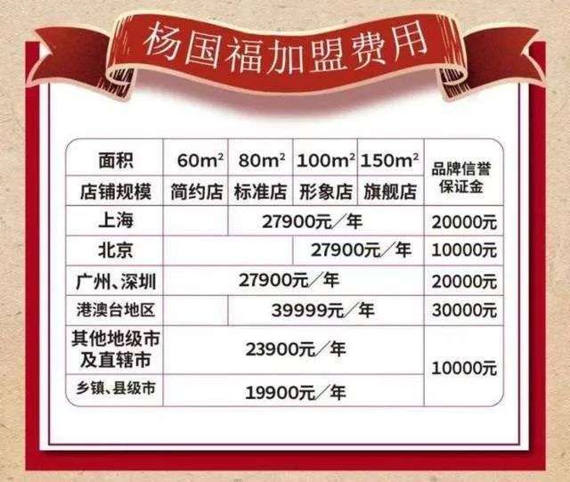毫無(wú)疑問(wèn),加盟費(fèi)是楊國(guó)福重要的營(yíng)收來(lái)源。根據(jù)楊國(guó)福招商加盟公眾號(hào)發(fā)布的2022年加盟政策,楊國(guó)福在不同地區(qū)的加盟費(fèi)用有所區(qū)別,在3980元至39999元不等,在北上廣等城市一年則需繳納27900元。