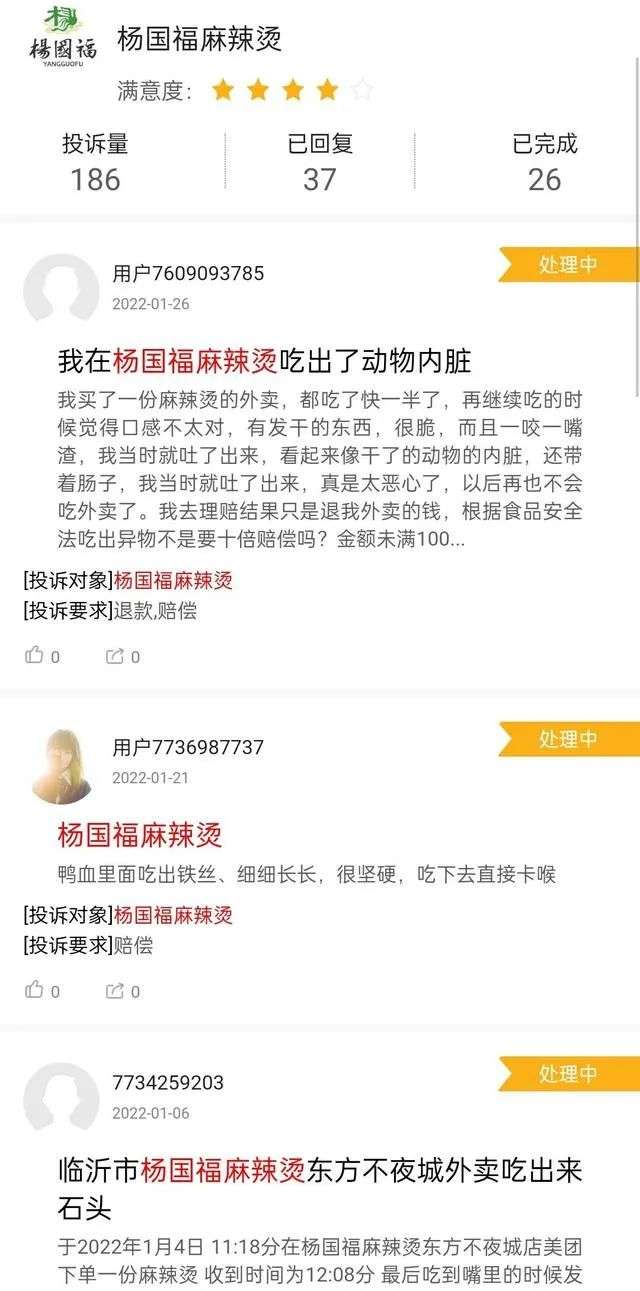 而在新浪黑貓投訴平臺(tái)中,大量消費(fèi)者投訴楊國(guó)福麻辣燙中吃出鐵絲、動(dòng)物內(nèi)臟、蟲(chóng)子、頭發(fā)等異物,更有消費(fèi)者因食用楊國(guó)福麻辣燙導(dǎo)致腸胃炎、被異物刺傷嗓子等申請(qǐng)理賠。