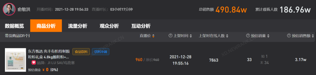 比如去年12月28日,俞敏洪直播間賣的最貴的產(chǎn)品,是一個雞鹿塞兆豐有機特質(zhì)顆粒粉禮盒裝,4.8kg顆粒粉+4.8kg雪花粉,售價為960元。因其售價過高,也成為當(dāng)天帶貨量最少的產(chǎn)品,只賣出33件。