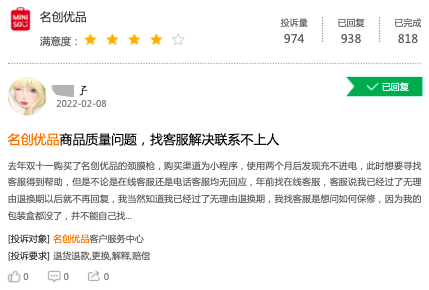 根據(jù)黑貓投訴平臺數(shù)據(jù)顯示,截至3月2日,名創(chuàng)優(yōu)品相關(guān)投訴量達(dá)974條,產(chǎn)品質(zhì)量問題、侵犯客戶隱私、涉嫌抄襲、二次售賣、虛假宣傳等負(fù)面也紛紛給名創(chuàng)優(yōu)品打上負(fù)面標(biāo)簽。
