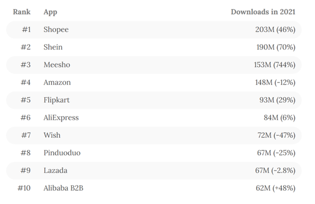 直到今年年初,一則公開數(shù)據(jù)讓Lisa吃驚起來——市場研究機構(gòu)Apptopia的最新數(shù)據(jù)顯示,Shopee已成為2021年全球購物應(yīng)用下載量排名第一的電商平臺。