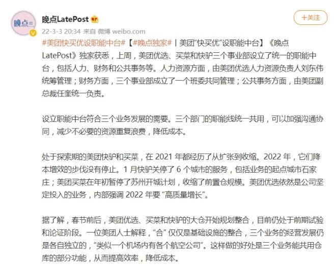 美團(tuán)三個(gè)事業(yè)部設(shè)立統(tǒng)一職能中臺 涉及優(yōu)選、買菜、快驢業(yè)務(wù)