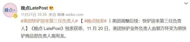 值得一提的是,此前有媒體報(bào)道,在去年11月20日,美團(tuán)快驢業(yè)務(wù)負(fù)責(zé)人由郭萬懷變?yōu)樵祗H商品部負(fù)責(zé)人高雨龍。而在這之前,美團(tuán)把優(yōu)選、快驢和買菜三塊業(yè)務(wù)交由陳亮統(tǒng)一負(fù)責(zé),郭萬懷協(xié)助陳亮管理。隨后,美團(tuán)優(yōu)選的各業(yè)務(wù)負(fù)責(zé)人轉(zhuǎn)向郭萬懷匯報(bào),郭萬懷向陳亮匯報(bào)。