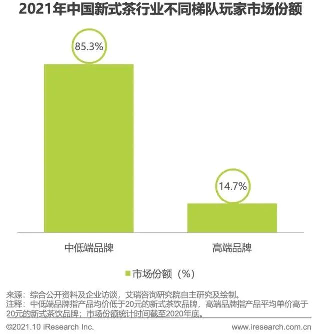 據(jù)艾瑞咨詢測算,2021年以蜜雪冰城為代表的中低端連鎖茶飲品牌在新式茶飲行業(yè)中所占市場份額居于前列,喜茶、奈雪的茶、樂樂茶等高端茶飲品牌共占約為14.7%的市場份額。