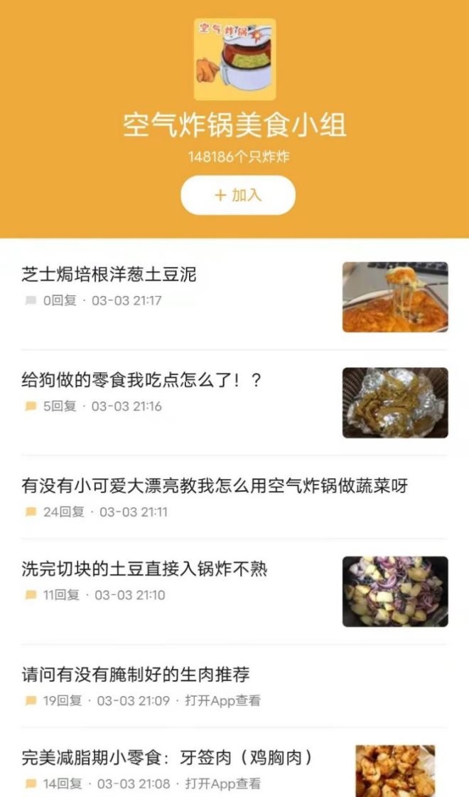 在豆瓣上,一個(gè)叫”空氣炸鍋美食小組”的討論貼里聚集了超14.8萬人,每天都有不同的人發(fā)布用空氣炸鍋制作的美食。“給我一口空氣炸鍋,我可以炸一切”,這樣的討論在微博、貼吧、小紅書,甚至微信公眾號(hào)等社交平臺(tái)并不少見。
