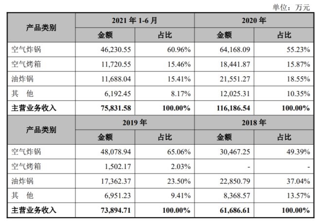 招股書顯示,比依股份成立于2001年,是一家以空氣炸鍋、空氣烤箱、油炸鍋、煎烤器等加熱類廚房小家電產(chǎn)品的設(shè)計(jì)、制造和銷售為核心業(yè)務(wù)的企業(yè)。其中,空氣炸鍋的收入占比目前已經(jīng)超過60%。而空氣炸鍋火爆,也讓這家鮮少露面的公司幾天內(nèi)市值飆漲,將這個(gè)幾乎被忽視的消費(fèi)賽道推進(jìn)人們的視野。