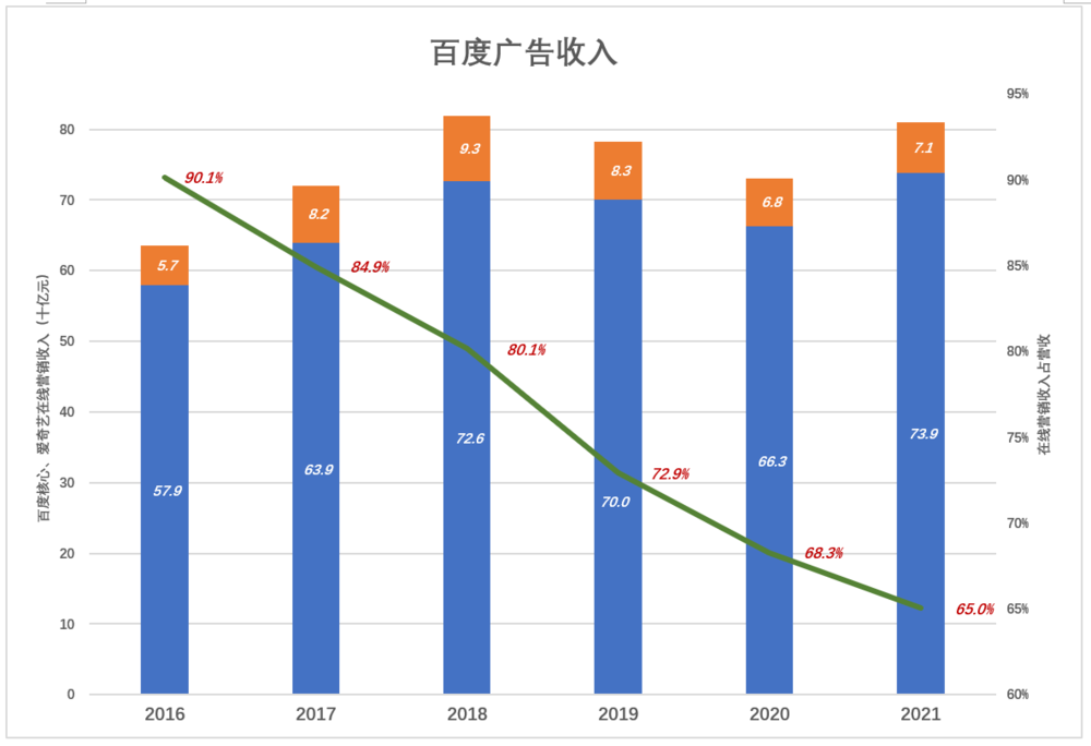 2021年,百度核心、愛(ài)奇藝廣告收入分別為739億、71億,合計(jì)占營(yíng)收的65%;